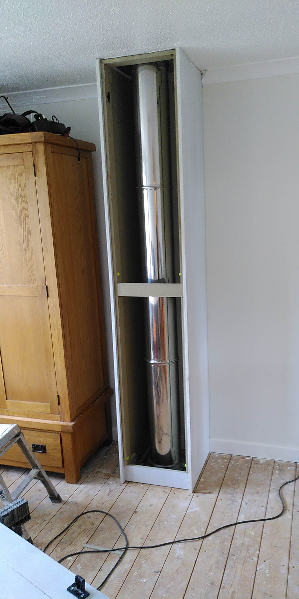 Matching shaker cladding was used to hide the flue from a wood burner.