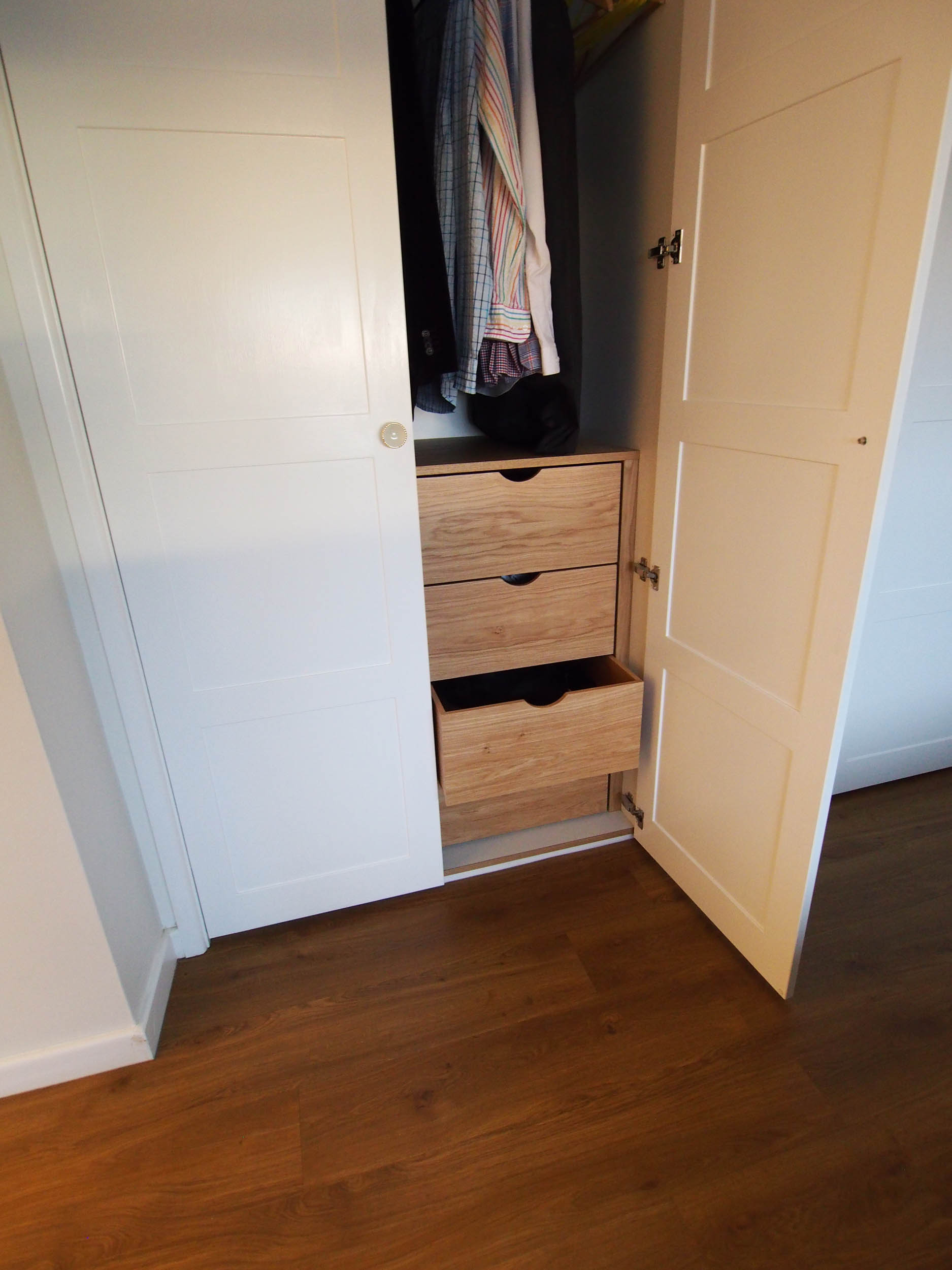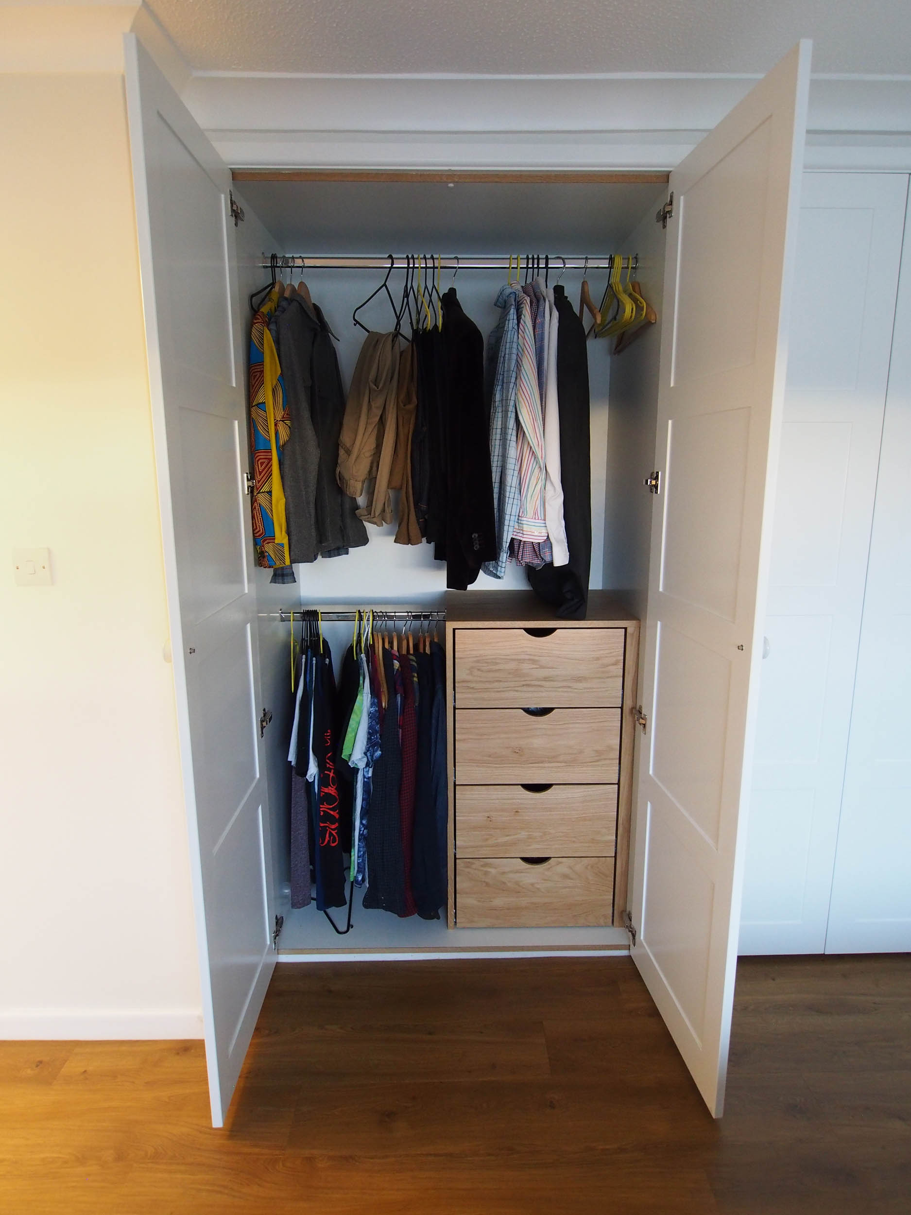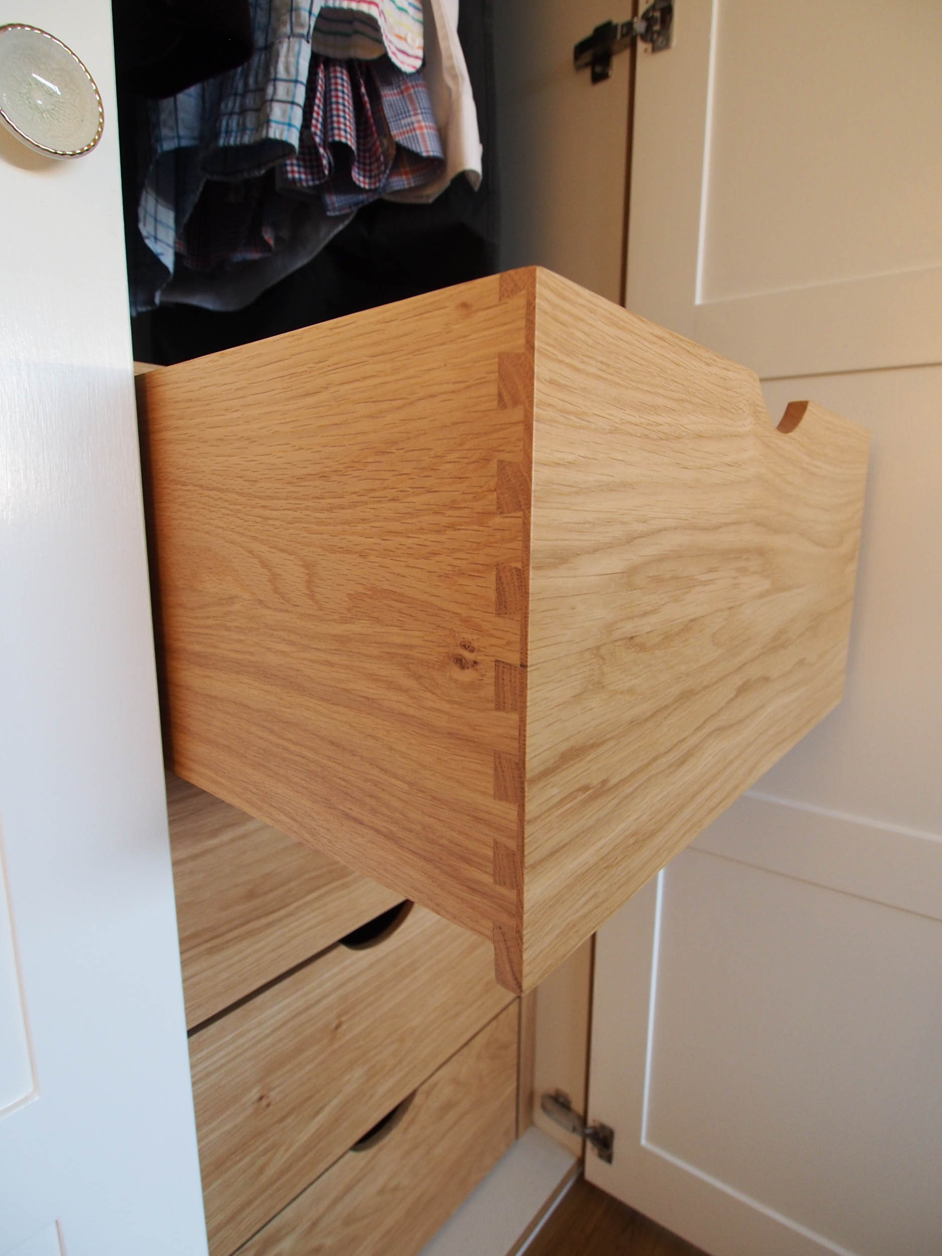 Two small wardrobes became one large, full-length wardrobe. A blockwork partition was removed, the space infilled with bespoke wardrobes, including drawers with dovetail joints.