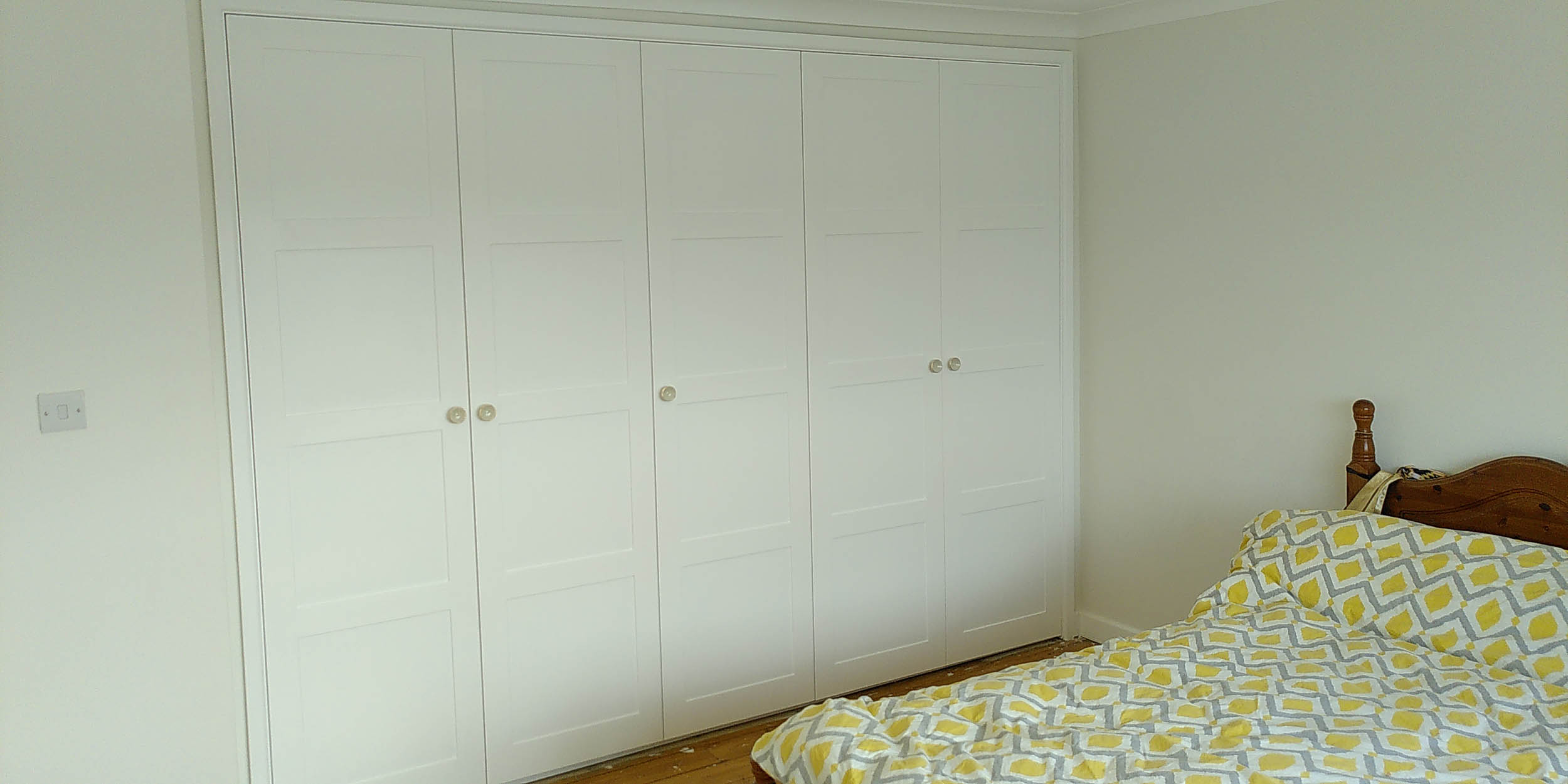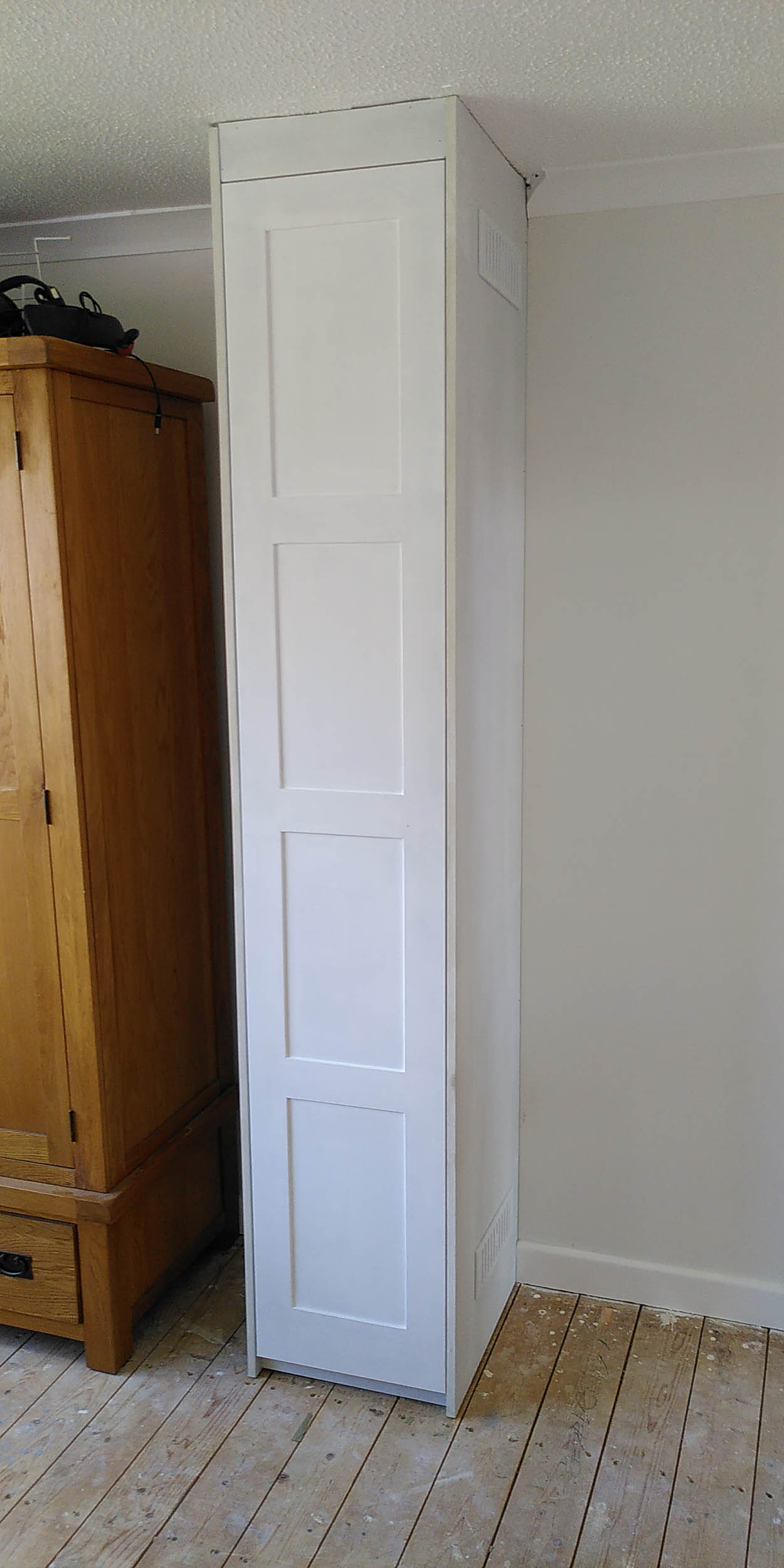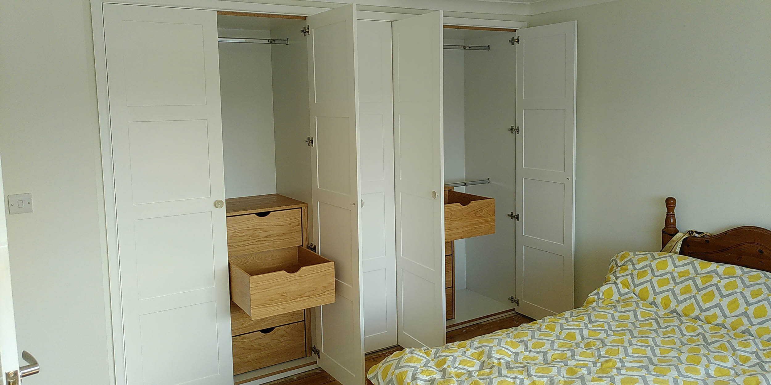 Two small wardrobes became one large, full-length wardrobe. A blockwork partition was removed, the space infilled with bespoke wardrobes, including drawers with dovetail joints.