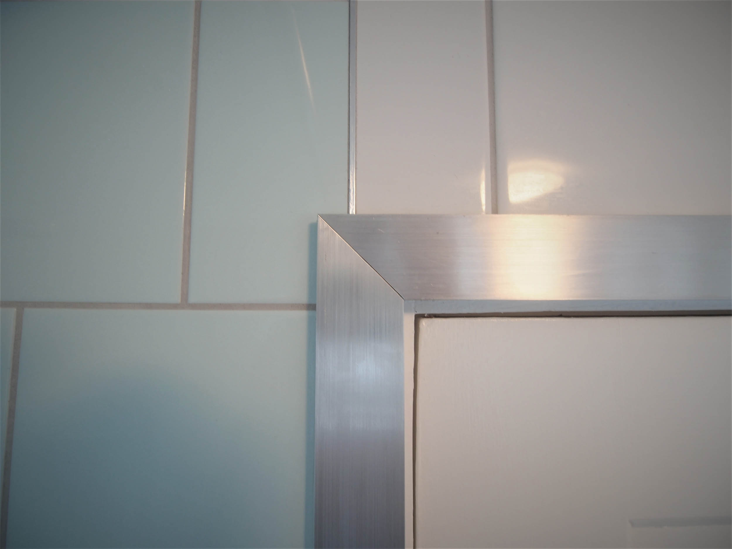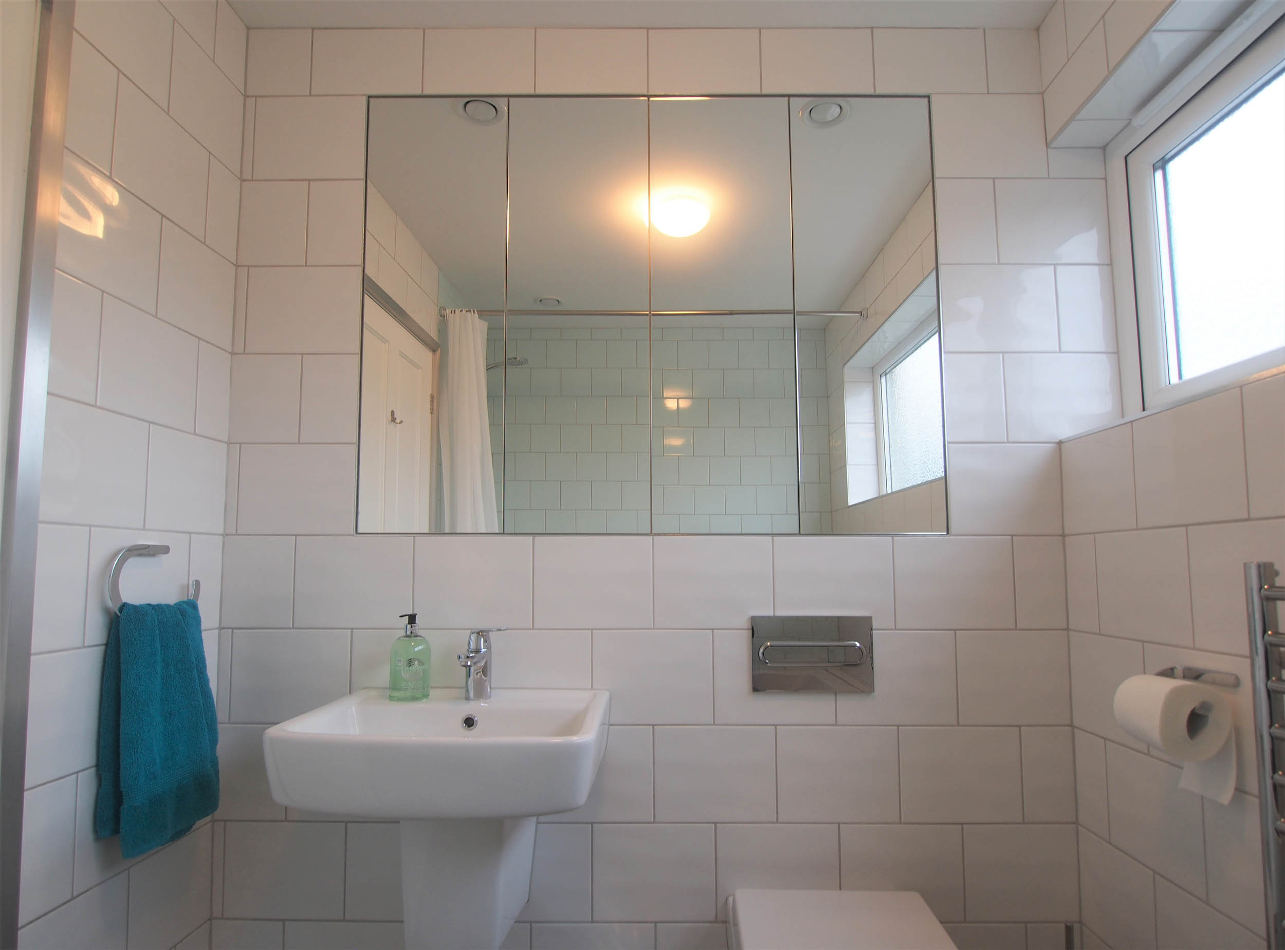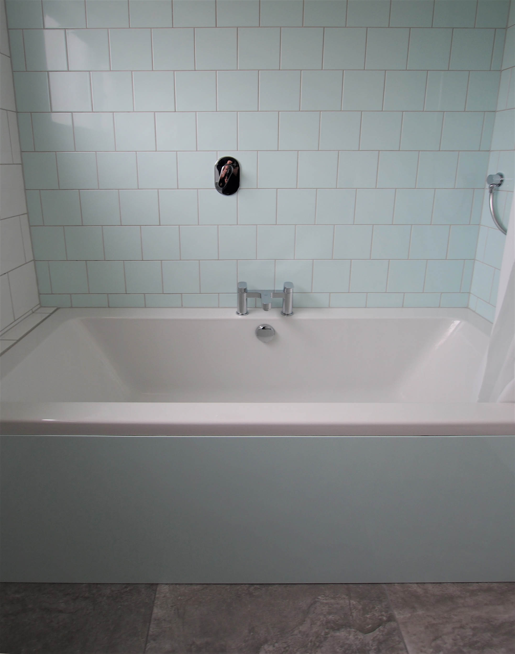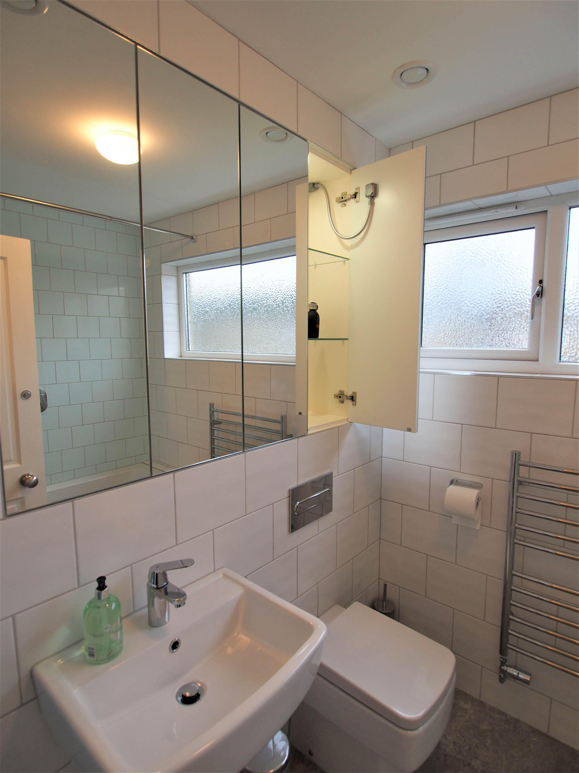 The bathroom was stripped back to the joists and studs. Exterior wall was insulated internally. A false wall was created to house the cistern and a large integrated mirror cabinet with heated mirror doors. The bath panel is a bespoke item spray finished to match the bath tiles. Aluminium architraves avoid the common problem of woodwork suffering in a humid environment.