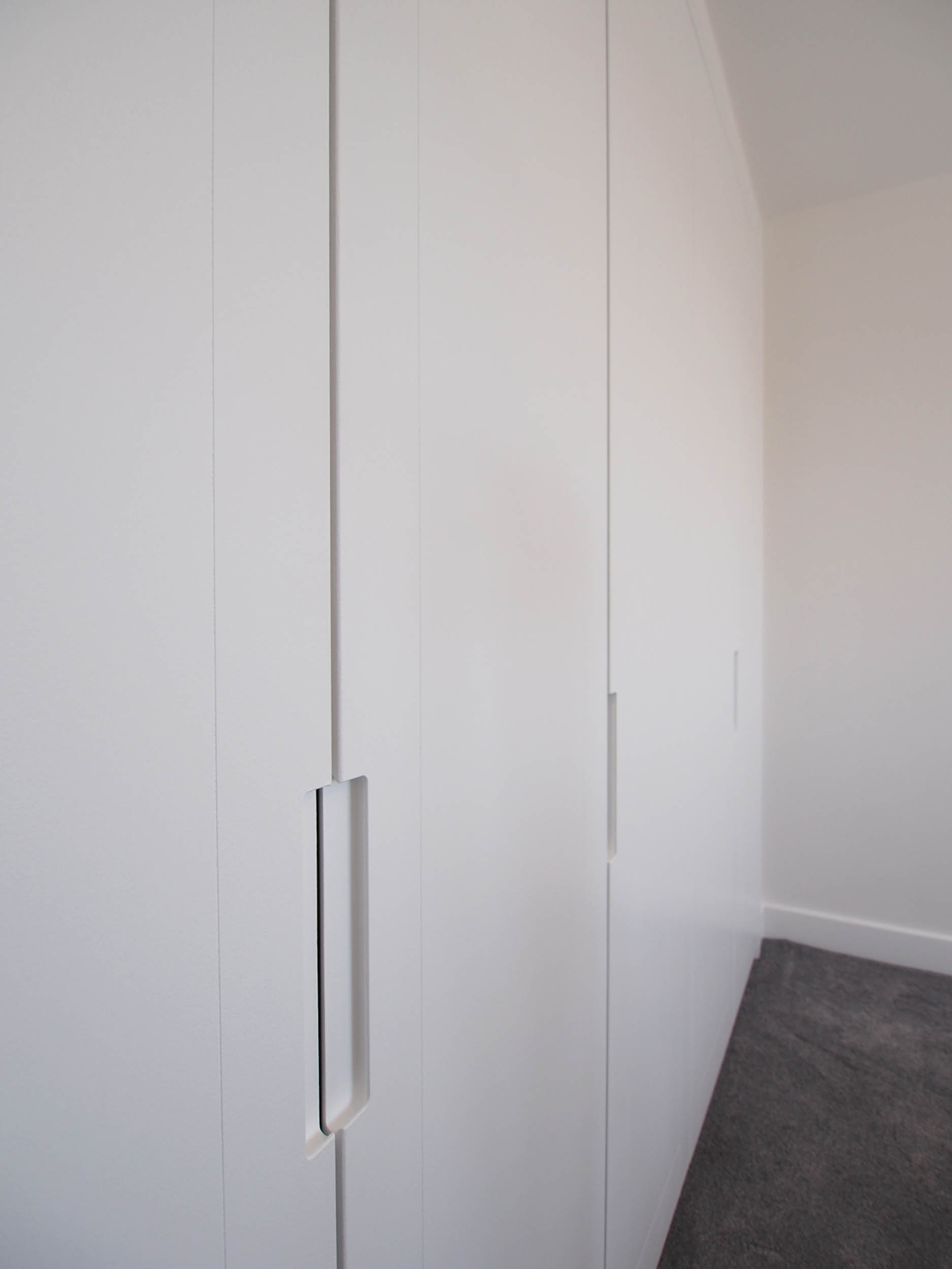 The wardrobe doors are slab MDF doors with a subtle groove pattern and recessed handles.