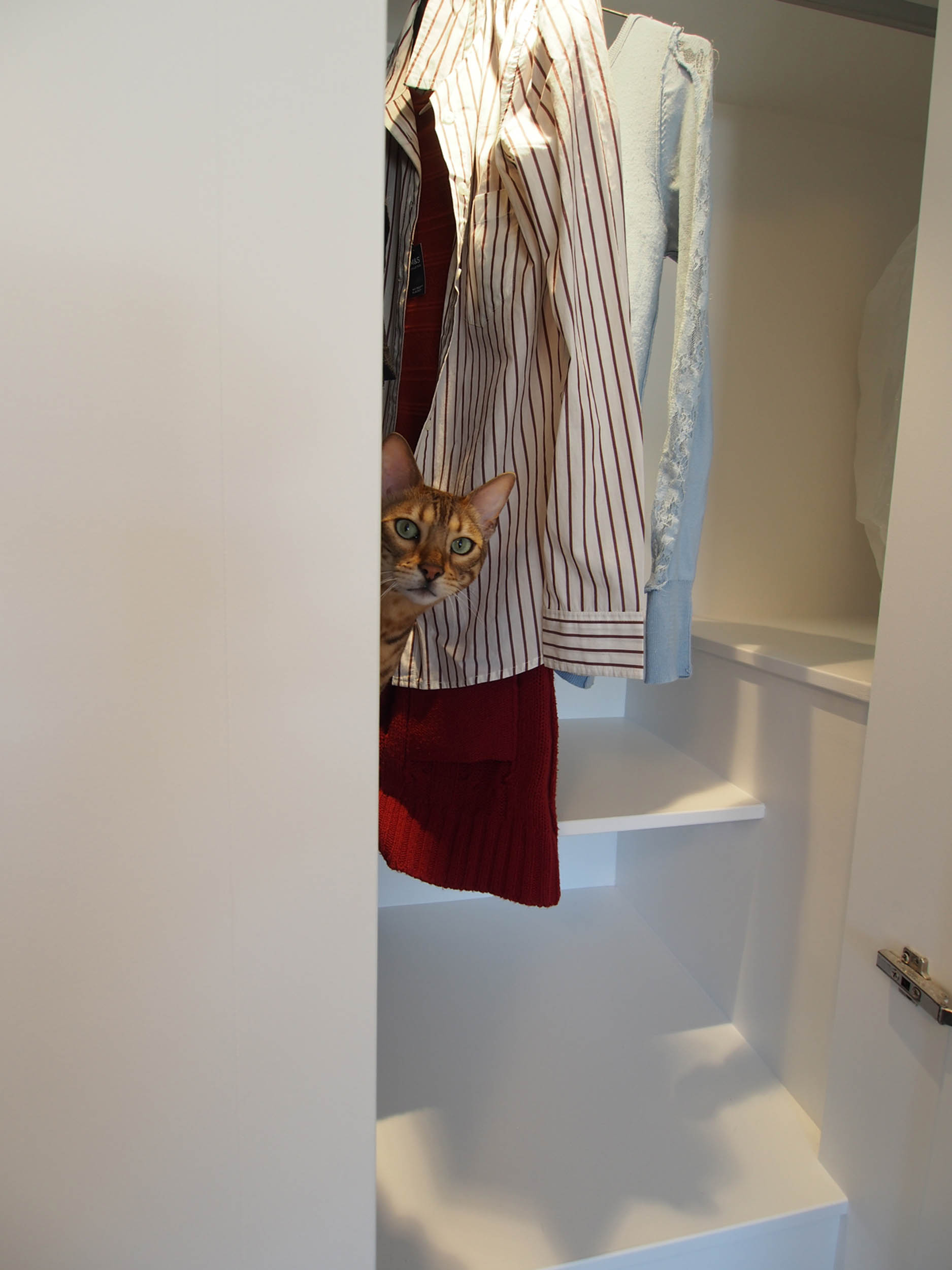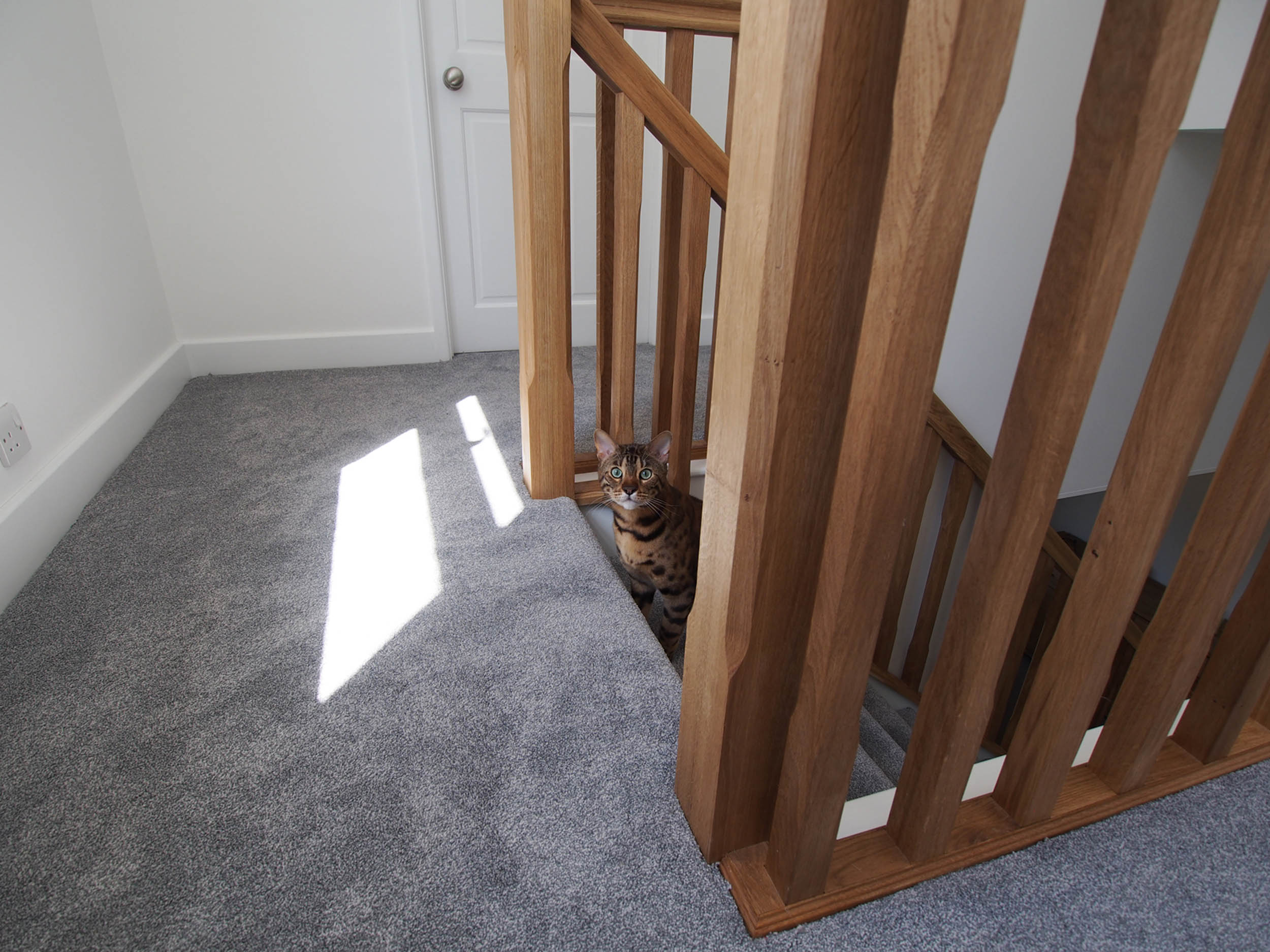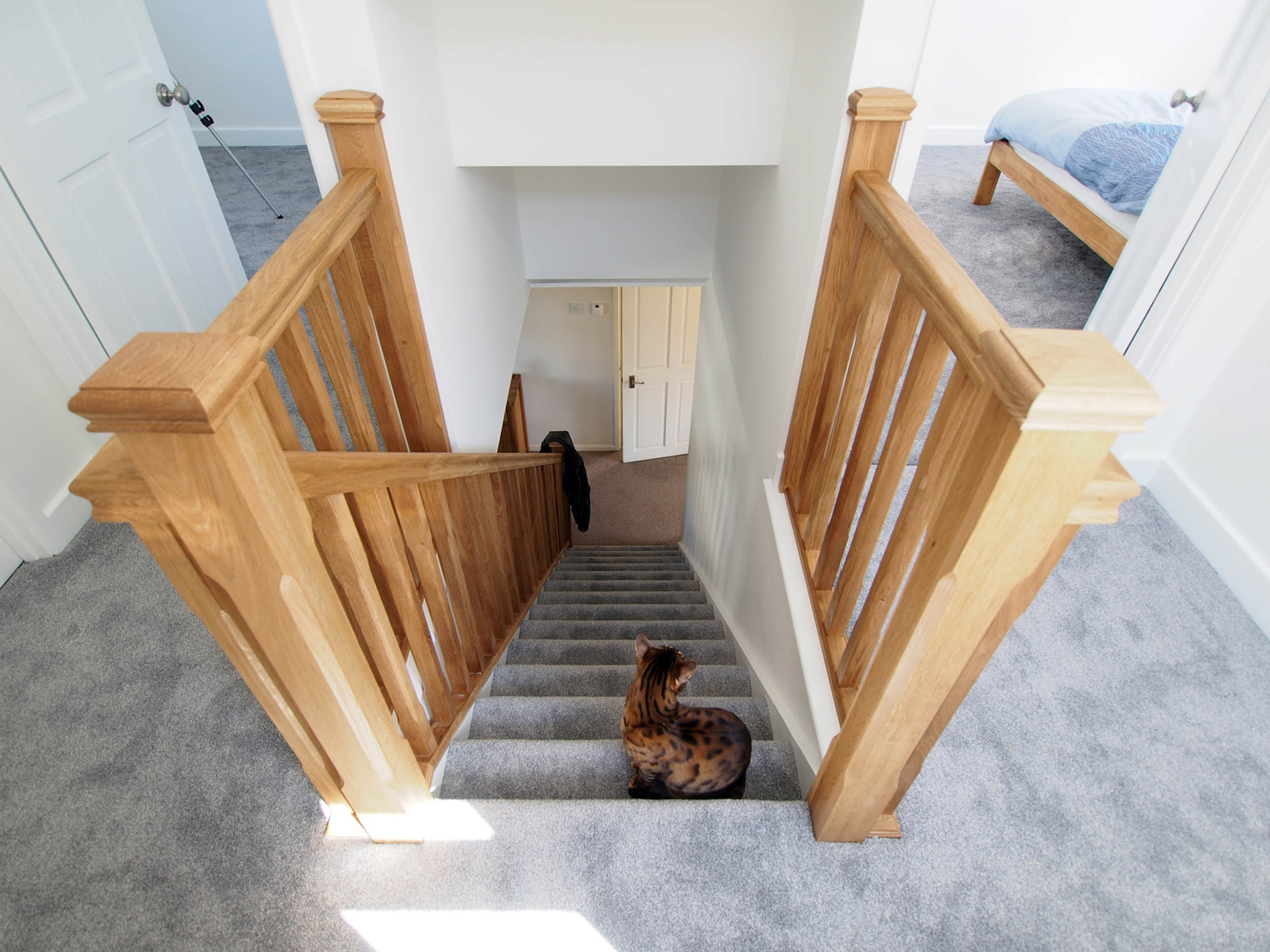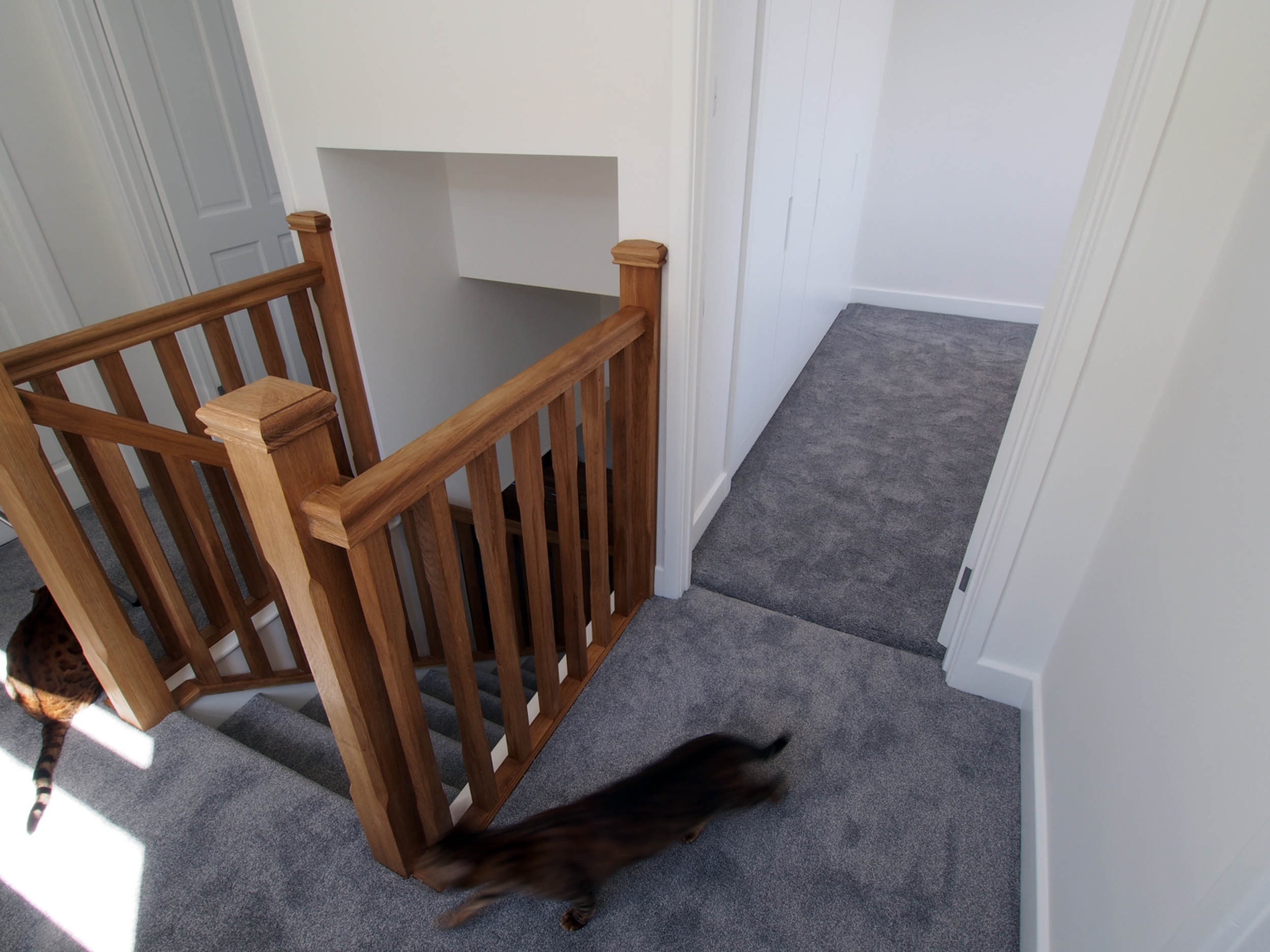 A 1960s horizontal balustrade was removed and replaced with oak stair parts. The stairwell volume was borrowed to create wardrobe space in both adjoining bedrooms, using every cubic centimetre of available volume. The client’s own electrician added lighting. The wardrobe depths were staggered so that both rooms have some full depth hanging space.