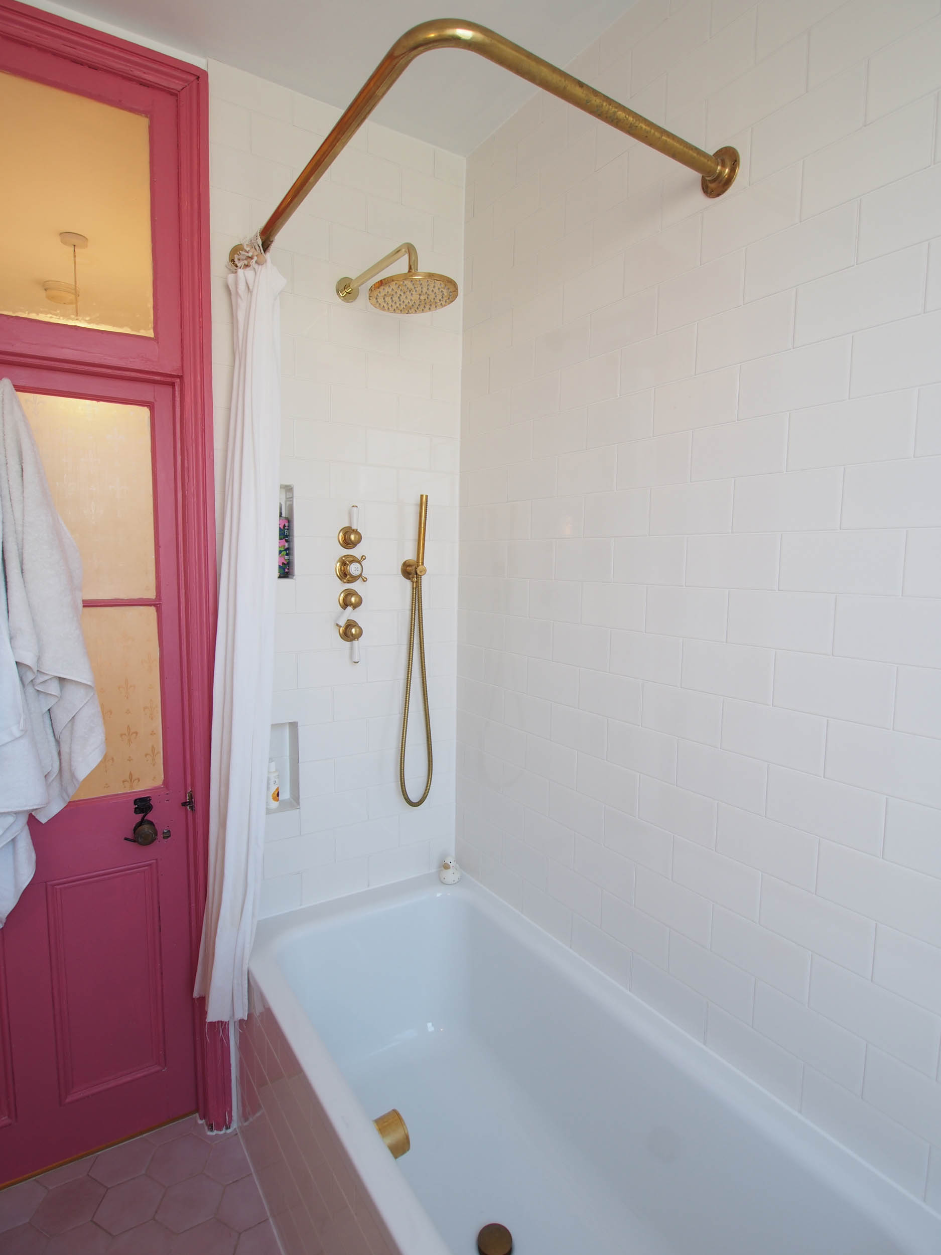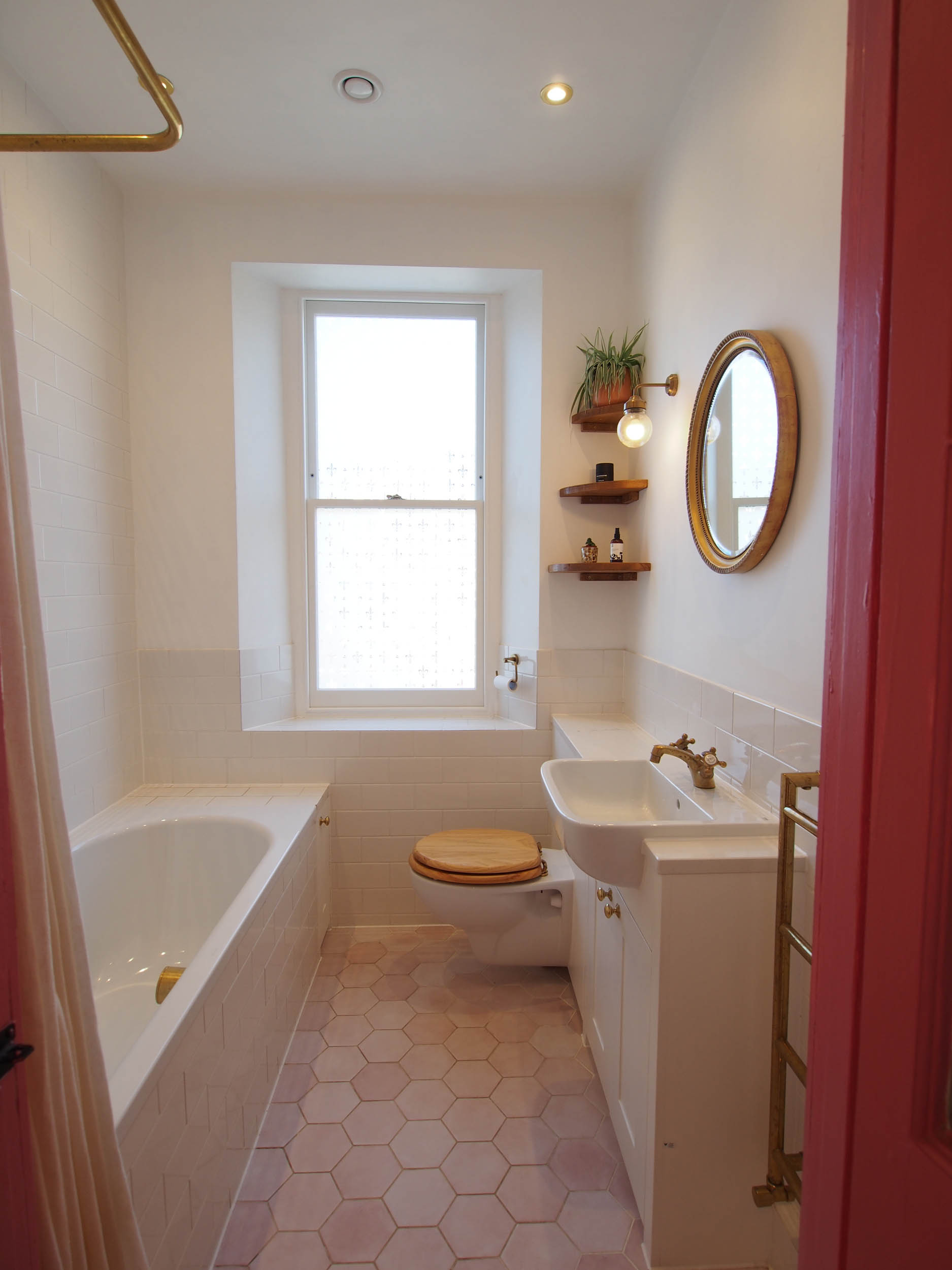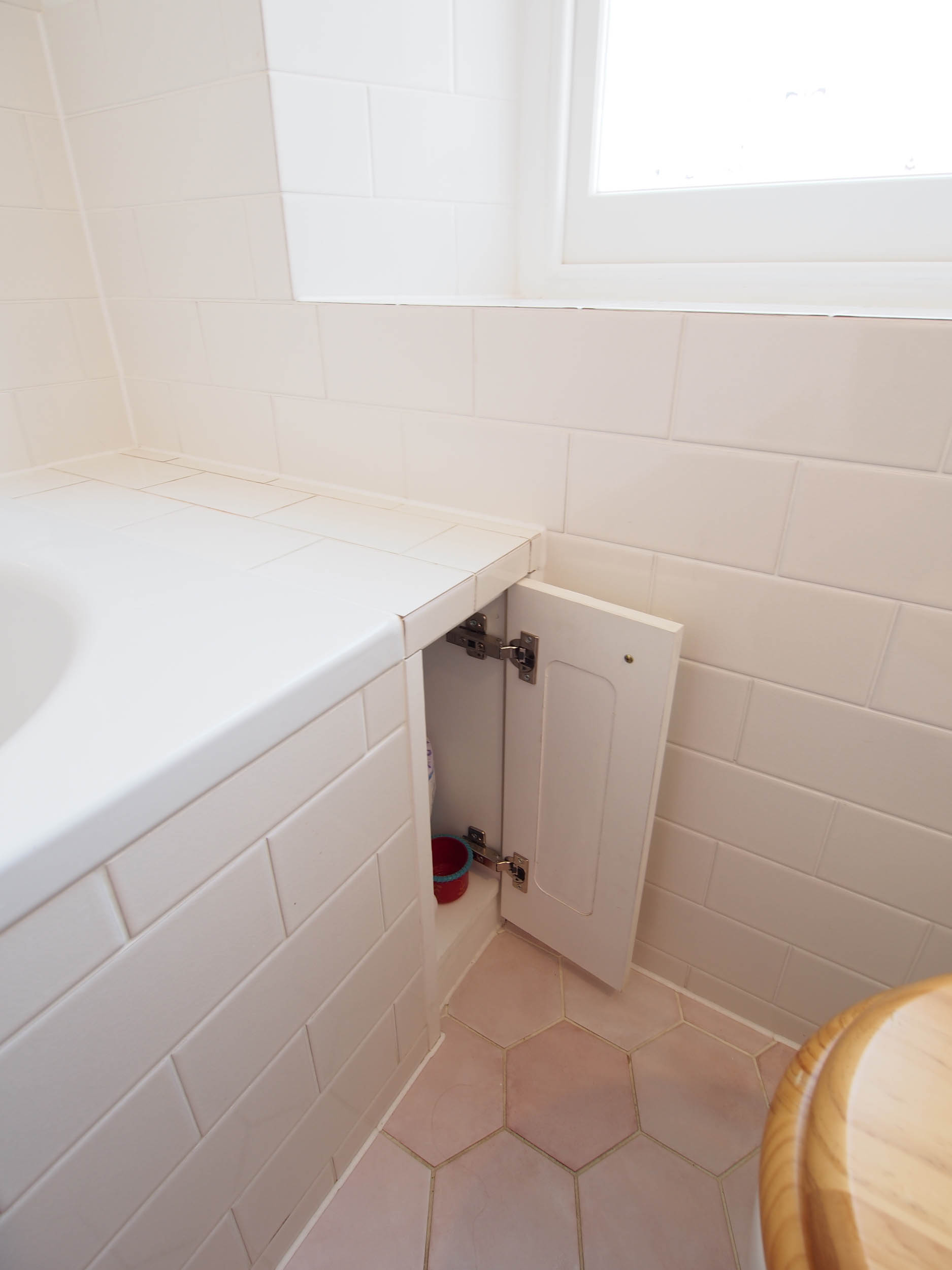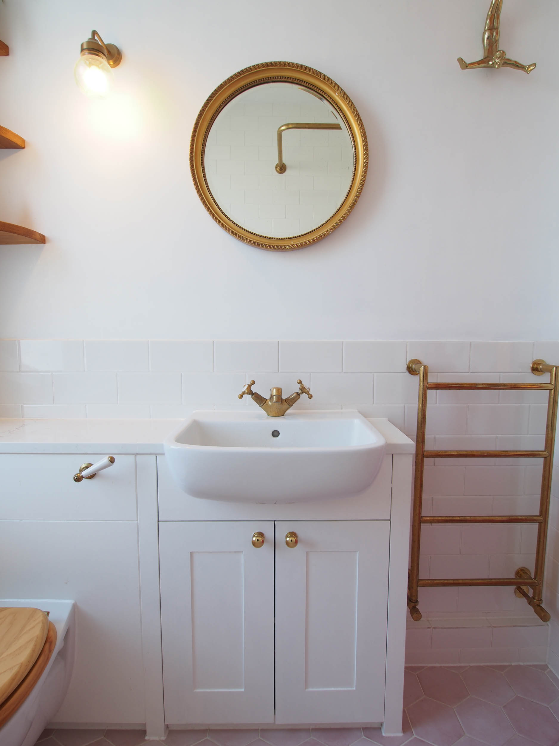 The bathroom was extensively remodelled. When the walls were stripped, multiple layers of plasterboard and tiles were found, and we managed to gain about an additional 100m in width. The floor joists had some water damage, so were repaired. The external wall was insulated internally, and the ventilation upgraded to a powerful loft-mounted inline vent, to eliminate condensation and mould. An impressive solid brass bath & shower mixer, supplied by the client, was installed inside the wall. Electric underfloor heating keeps feet warm & the floor dry. Bespoke vanity unit and bath-end storage by Parnosa, with a composite Quartz worktop by Avon Marble. Tiling by Rich at FineLines tiling, with mitred edge details.